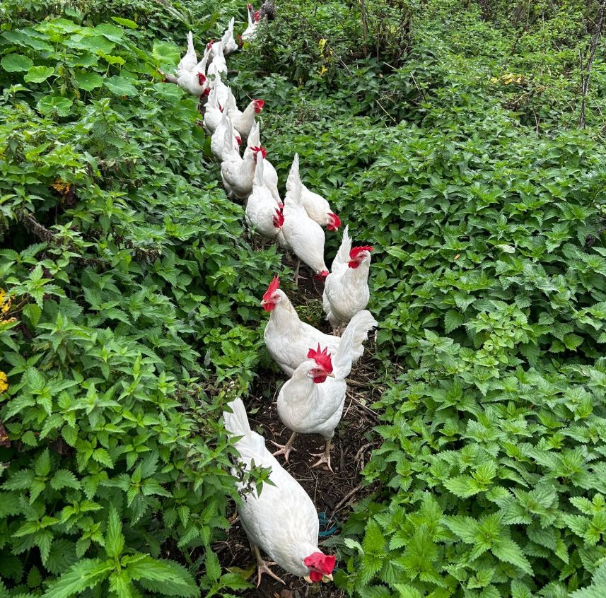 Back in October our leghorn chickens were making the most of the last dropped apples and scratching in the dirt. They are also extremely inquisitive, and decided to play a follow the leader game with our ranger May when she went to collect the egg